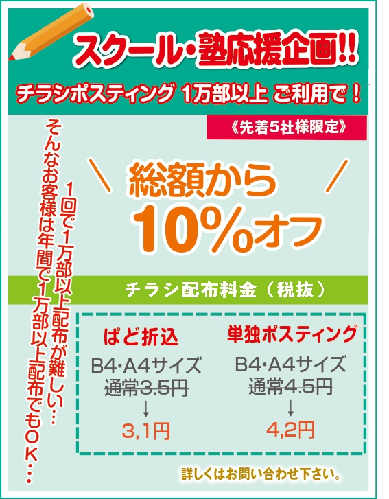 【先着5社限定】スクール・塾応援企画第2弾!1万部以上のチラシポスティングで総額割引キャンペーン実施中!